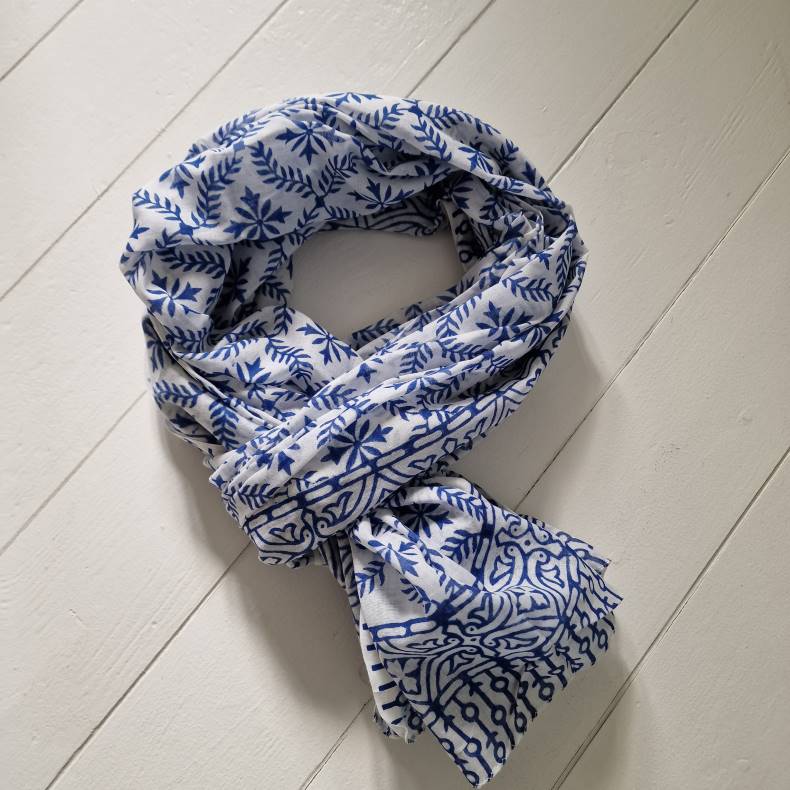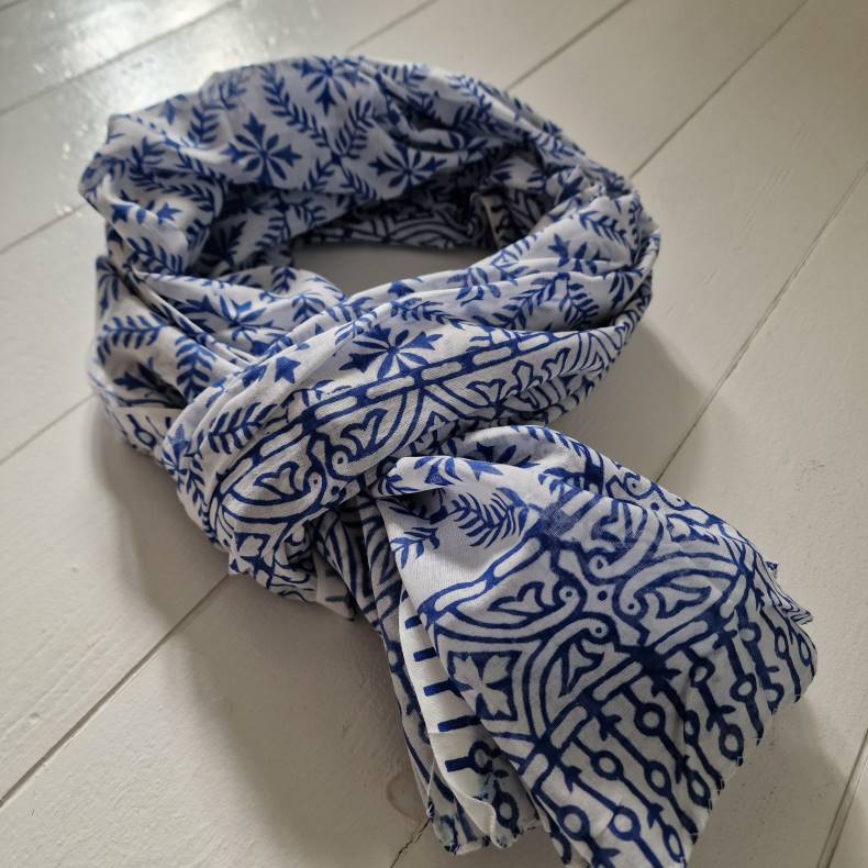Dette håndlavede tørklæde er skabt ved brug af traditionel indisk bloktryksteknik, hvilket gør hvert stykke helt unikt. Med sine harmoniske blå og hvide nuancer er det en både elegant og alsidig tilføjelse til garderoben – perfekt til at pifte et neutralt outfit op eller som en let sommersjal.