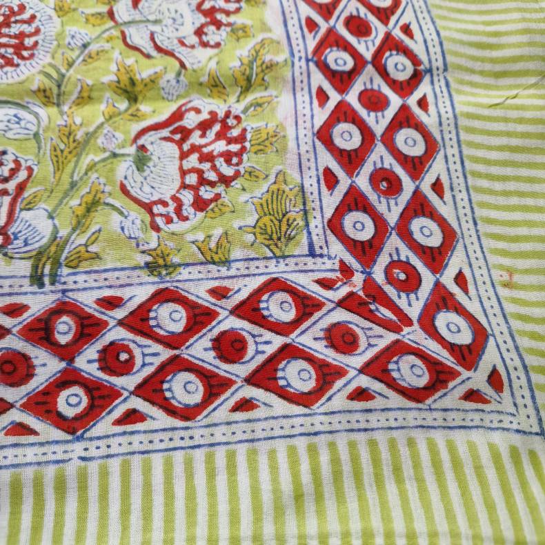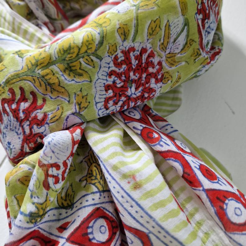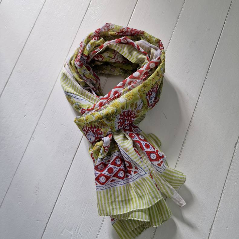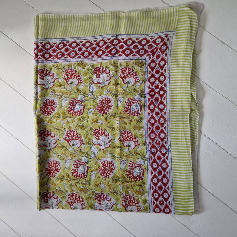 Bloktrykt bomulds tørklæde limegrøn/rød 115x 182