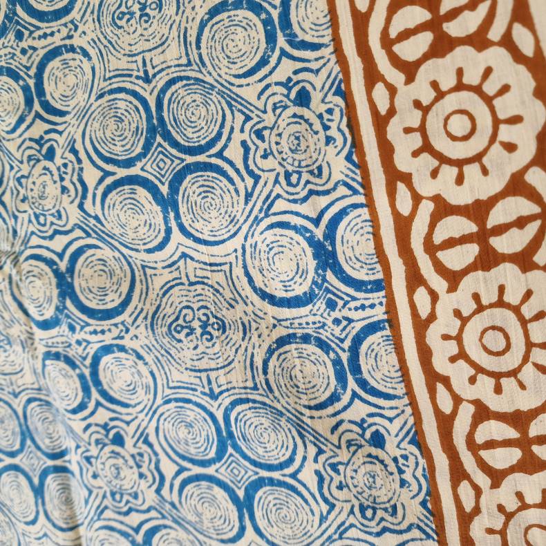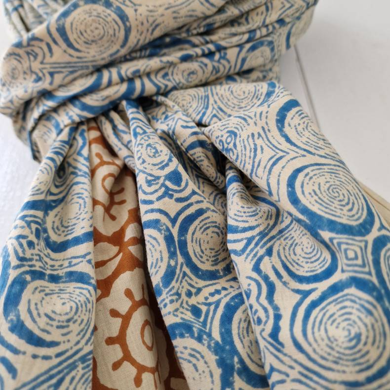 Ubleget bloktrykt tørklæde blåt/carry 112x177 cm