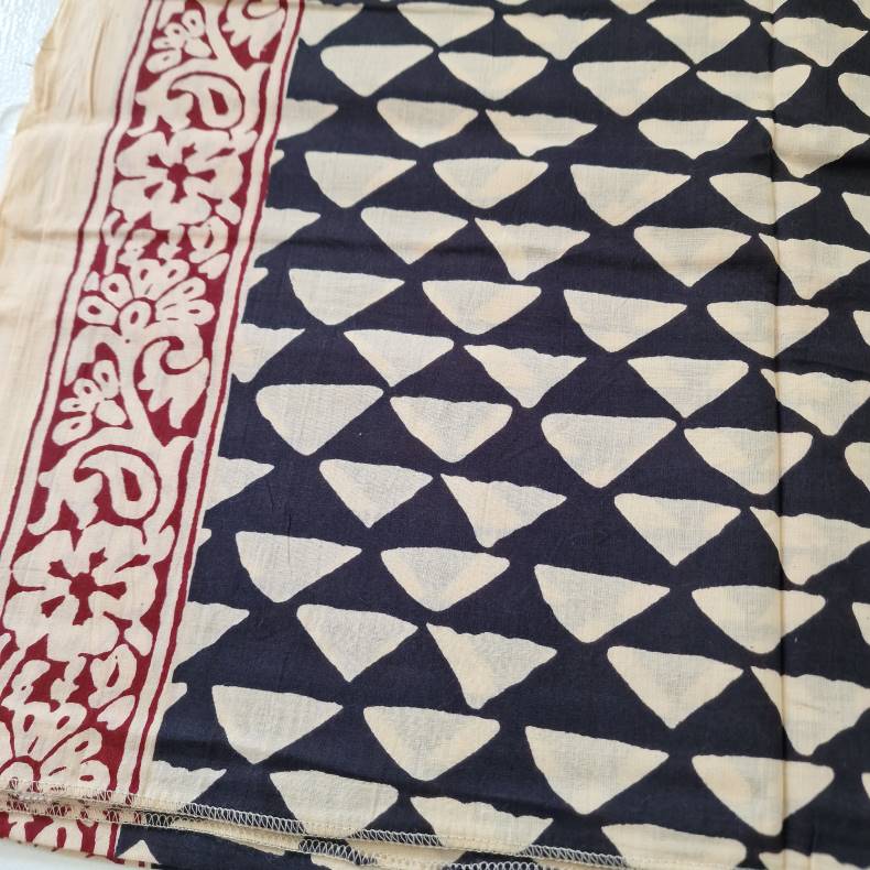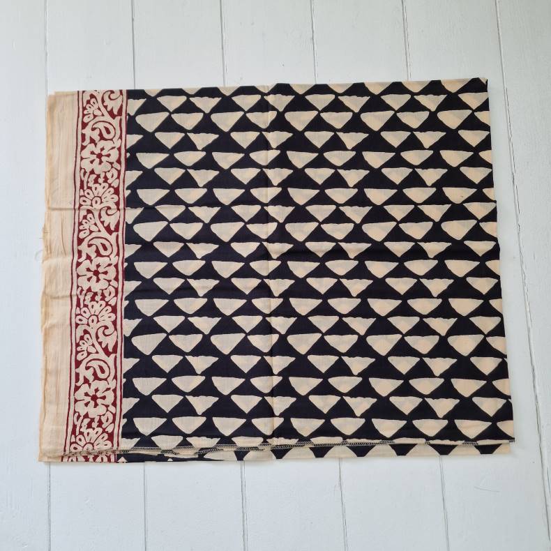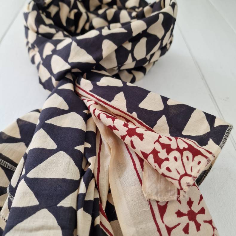Ubleget bloktrykt tørklæde sort/trekant/rød 110x177 cm