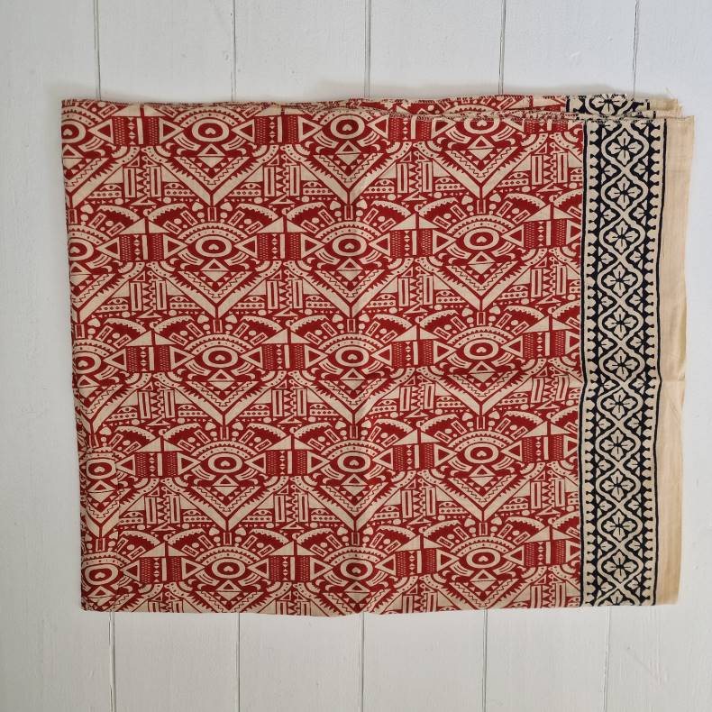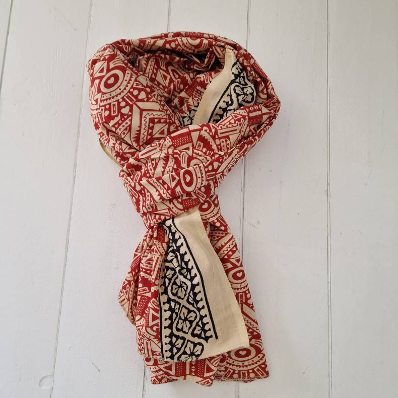 Ubleget bloktrykt tørklæde rødt/hjerte/sort 110x177 cm