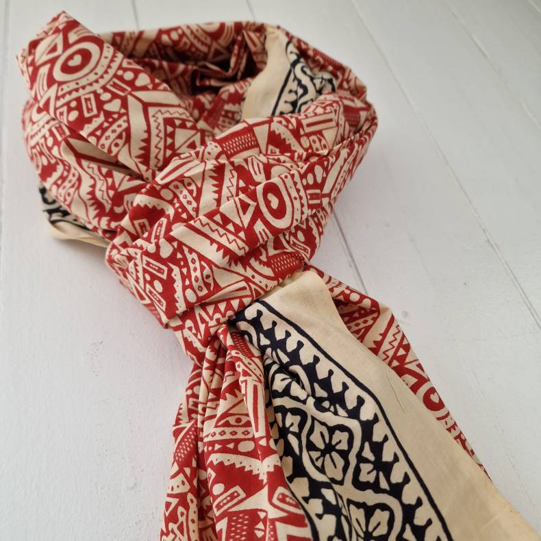 Med en generøs størrelse er tørklædet perfekt til at bruge om skuldrene, om halsen eller som en chic detalje på tasken. Hvert tørklæde er unikt, fremstillet med den traditionelle indiske bloktryksteknik, der giver charme og karakter.