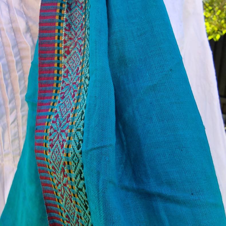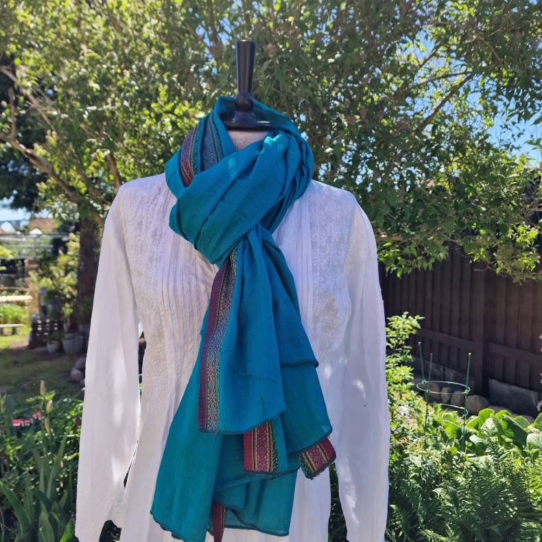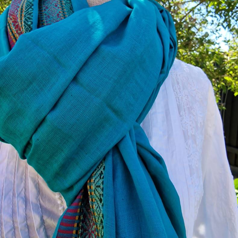 Turkis tørklæde med rød/gul bort