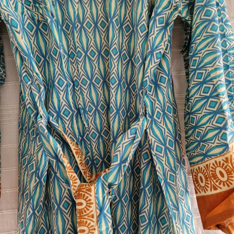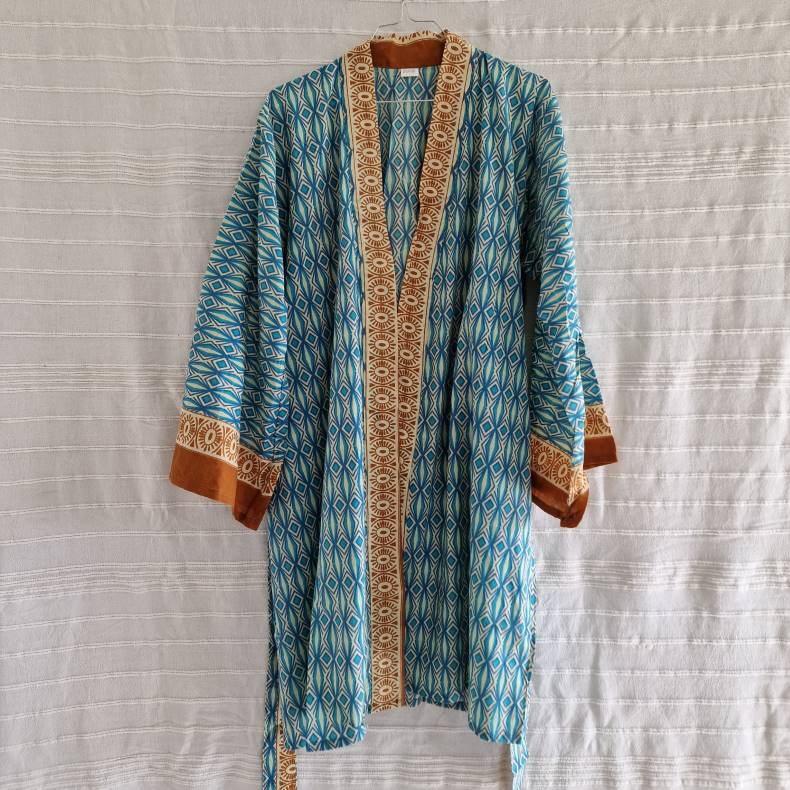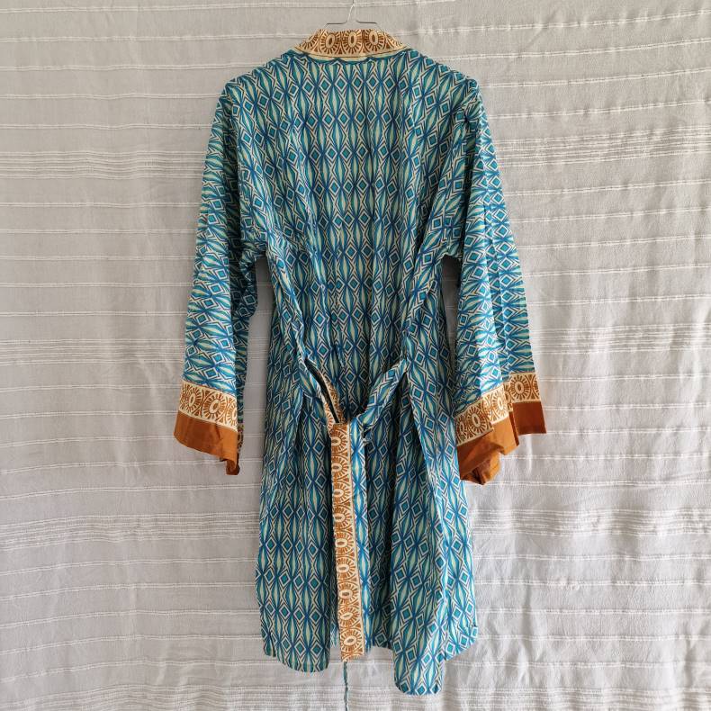 Lad dig charme af vores skønne kort bomulds kimono, der skaber den perfekte balance mellem afslappet stil og elegance. Det fine bloktrykte stof bringer liv og karakter til dit outfit, mens det bløde bomuldsmateriale sikrer komfort hele dagen lang.