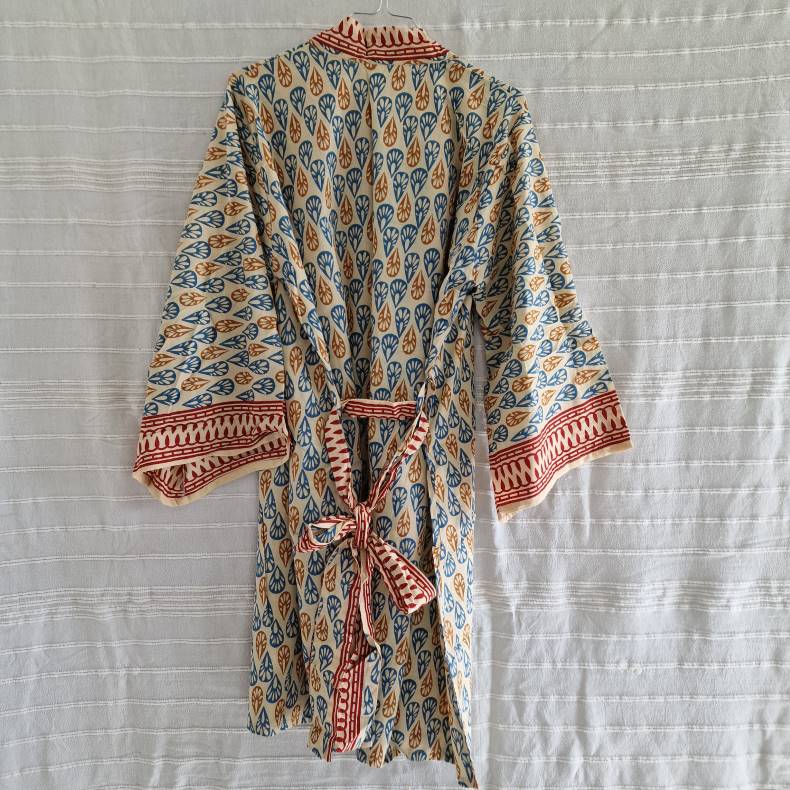 Giv dit outfit et eksotisk pift med denne kort bomulds kimono i smukke farver! Det unikke bloktryk i blå, gul, hvid og rød skaber et kunstnerisk udtryk, der skiller sig ud, uanset om du slapper af derhjemme eller er på farten.