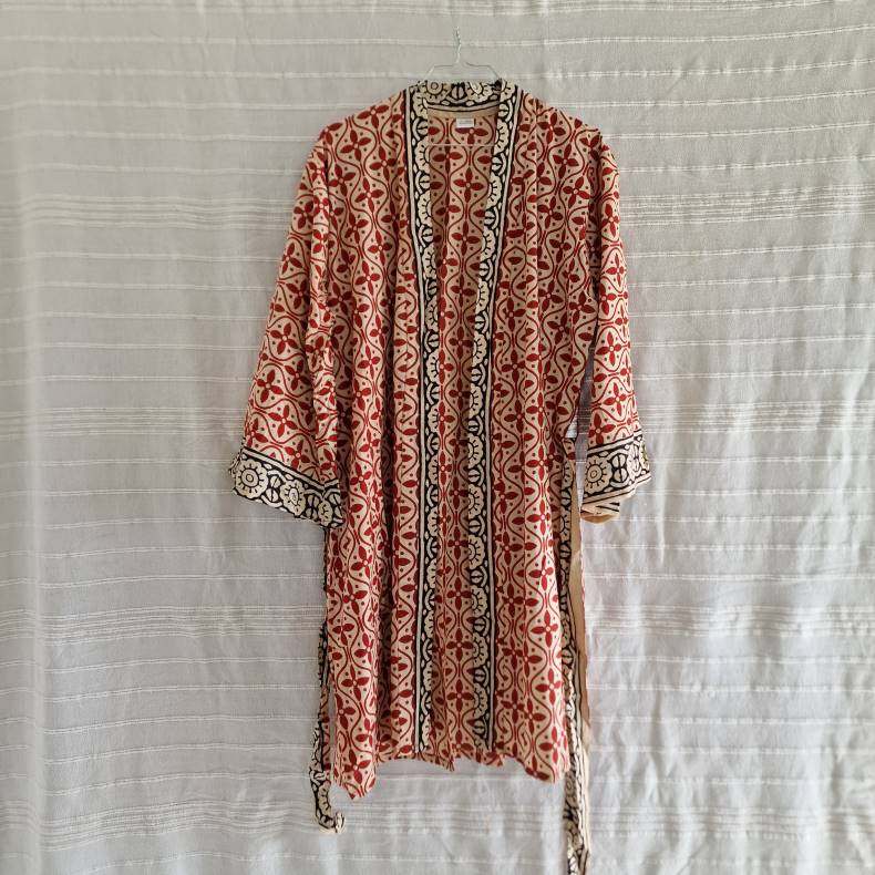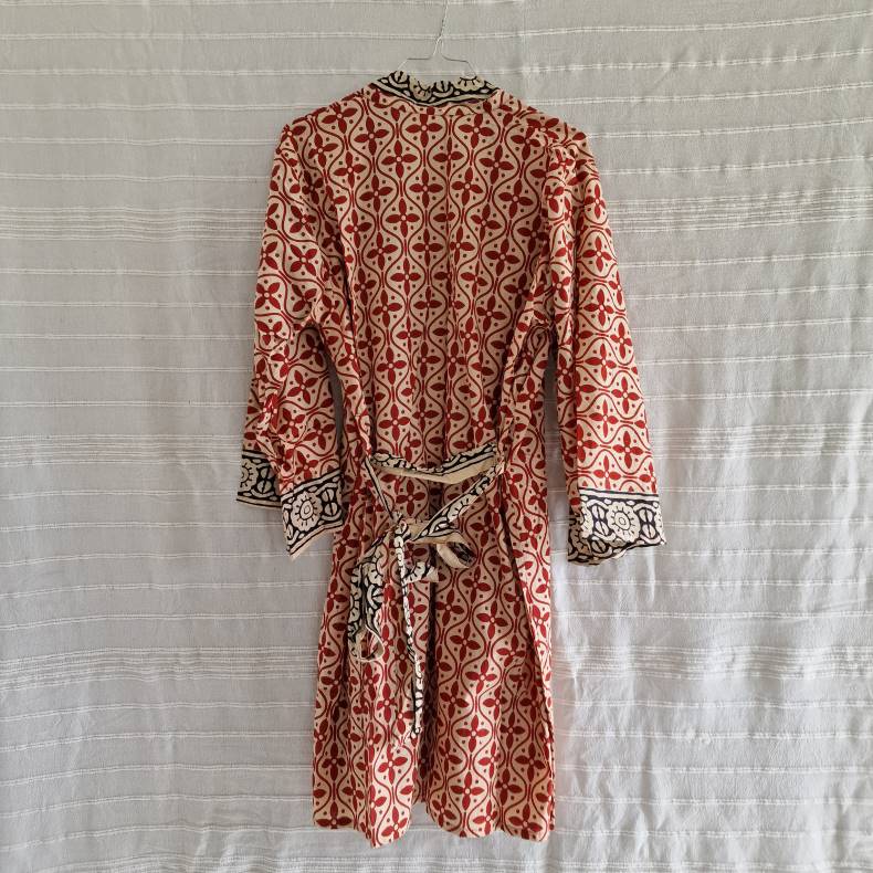 Forkæl dig selv med denne smukke kort bomulds kimono, der præsenterer et unikt bloktryk i fortryllende røde og sorte nuancer. Den lette og åndbare kvalitet gør den til det perfekte valg til varme dage, mens det elegante bælte tilføjer et strejf af stil og personlighed.
