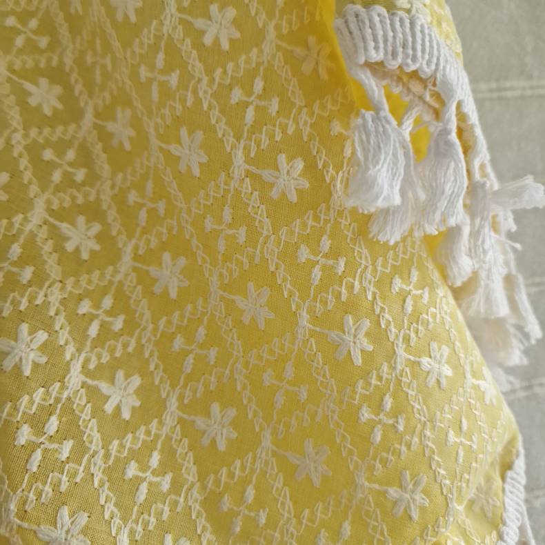 Mød din nye favorit i garderoben – en smuk bomuldskaftan med detaljeret broderi, der vil få alle til at vende sig om. Den elegante v-hals og snøringen under brystet giver dig mulighed for at tilpasse looket, så det sidder perfekt, uanset om du er på vej til stranden eller til en aften i byen.