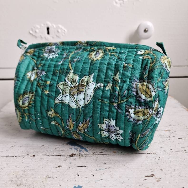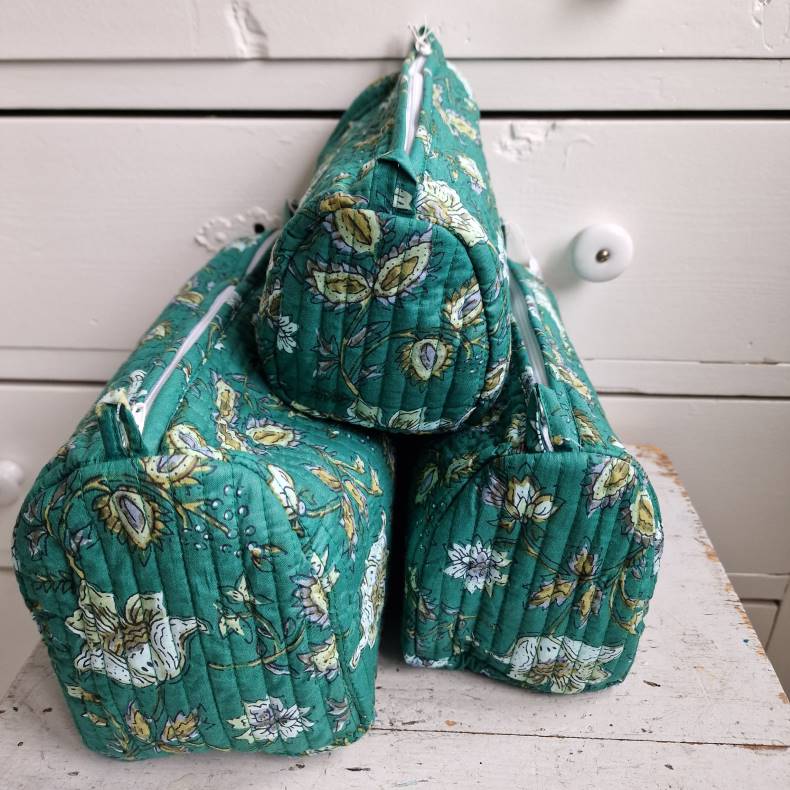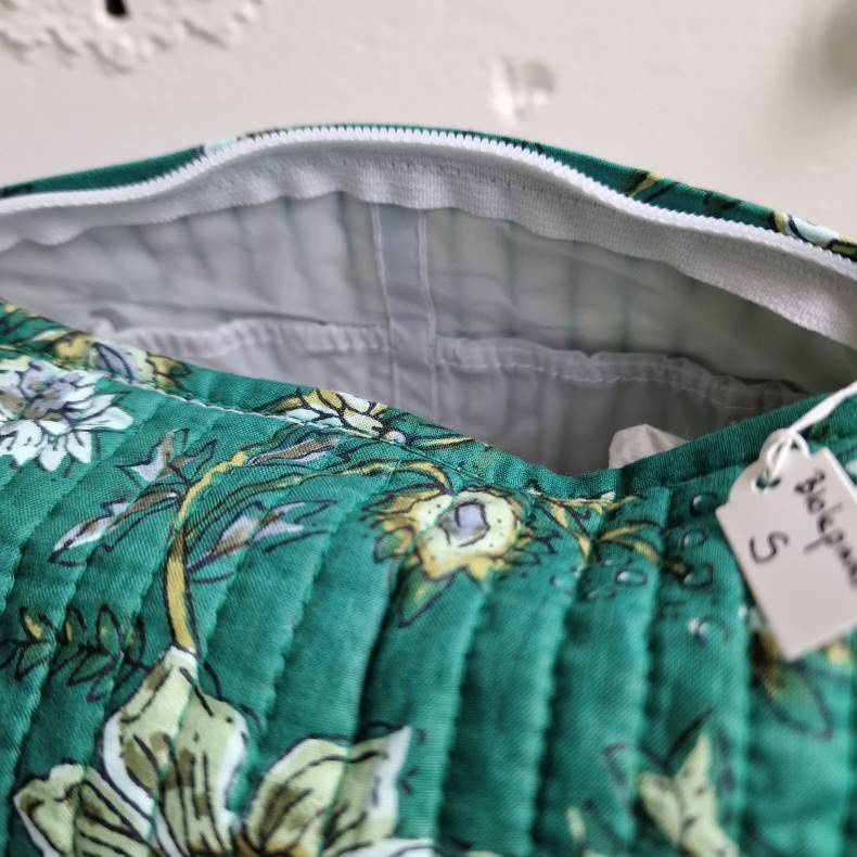 Forny din rejseoplevelse med vores håndlavede, grønne bloktrykte toilettaske i størrelse S. Skabt med omhu og kærlighed, kombinerer denne taske vatteret bomuldsstof i livlige farver og unikke mønstre.