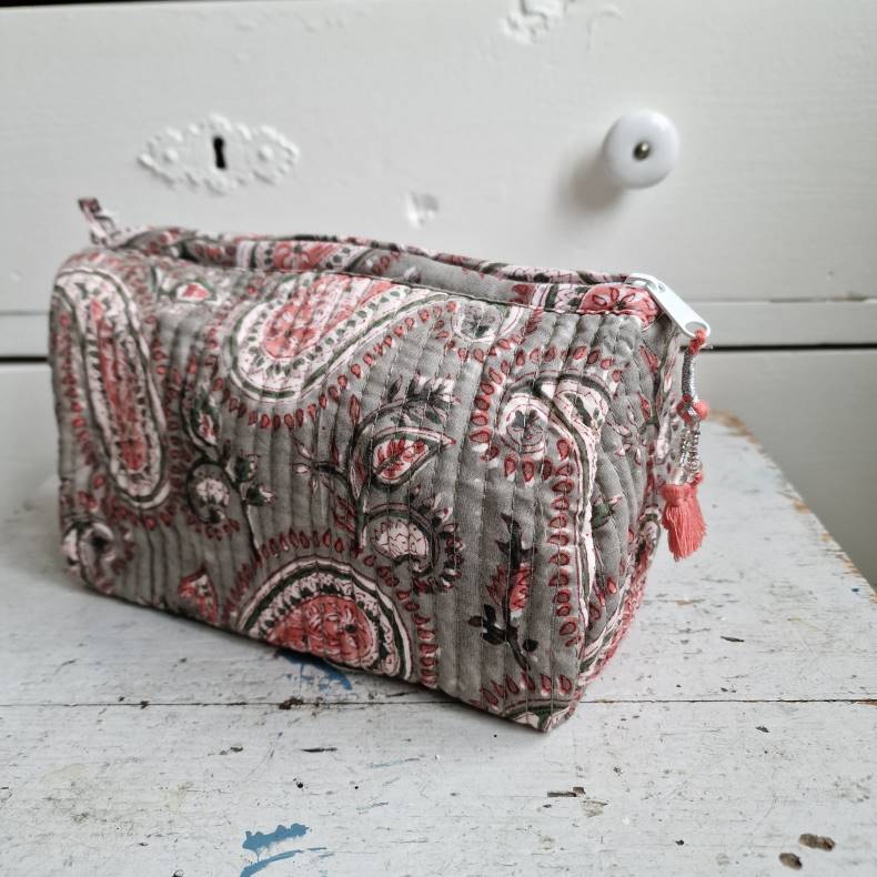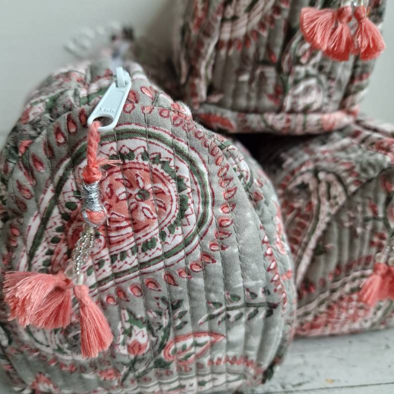 På jagt efter den perfekte toilettaske til dine eventyr? Vores håndlavede toilettaske i bloktryk kombinerer farverige mønstre og praktisk design. Fremstillet af vatteret bomuld, sikrer den både stil og holdbarhed. Indvendigt finder du fire praktiske lommer i plastik og en pålidelig lynlås lukning, der holder dine essentials organiseret og sikre.
