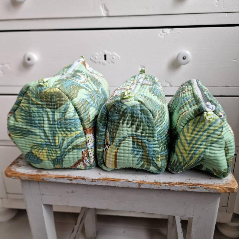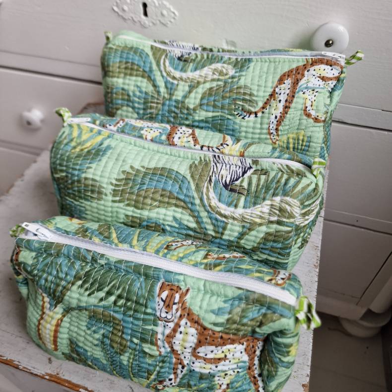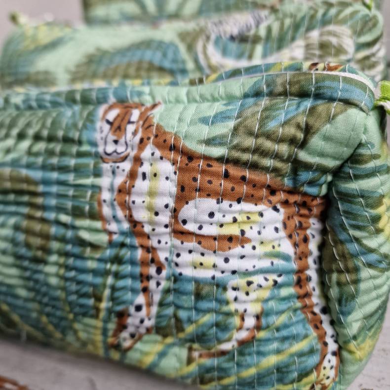 Disse grønne kosmetik- og toilettasker er håndlavede i Indien og dekoreret med bloktryk, der viser majestætiske tigere i en frodig skov. Hvert mønster er skabt ved traditionel bloktryksteknik, hvor håndskårne træblokke dyppes i farve og trykkes på stoffet, hvilket giver et unikt, levende og kunstnerisk udtryk. Kombinationen af grønne nuancer og dyremotiver skaber en frisk, naturskøn og eksotisk stil.