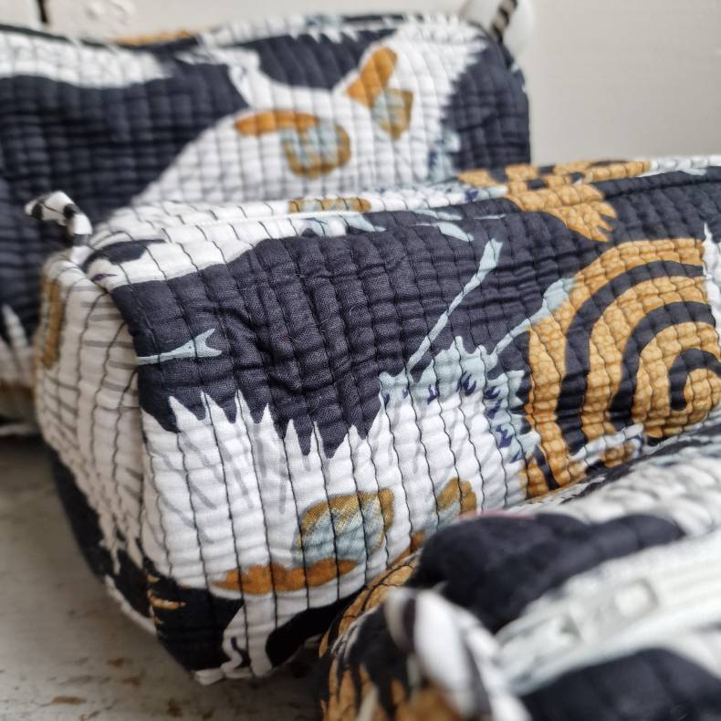 Sorte Indiske Bloktrykte Kosmetiktasker / Toilettasker – Håndlavet Indisk Kunsthåndværk