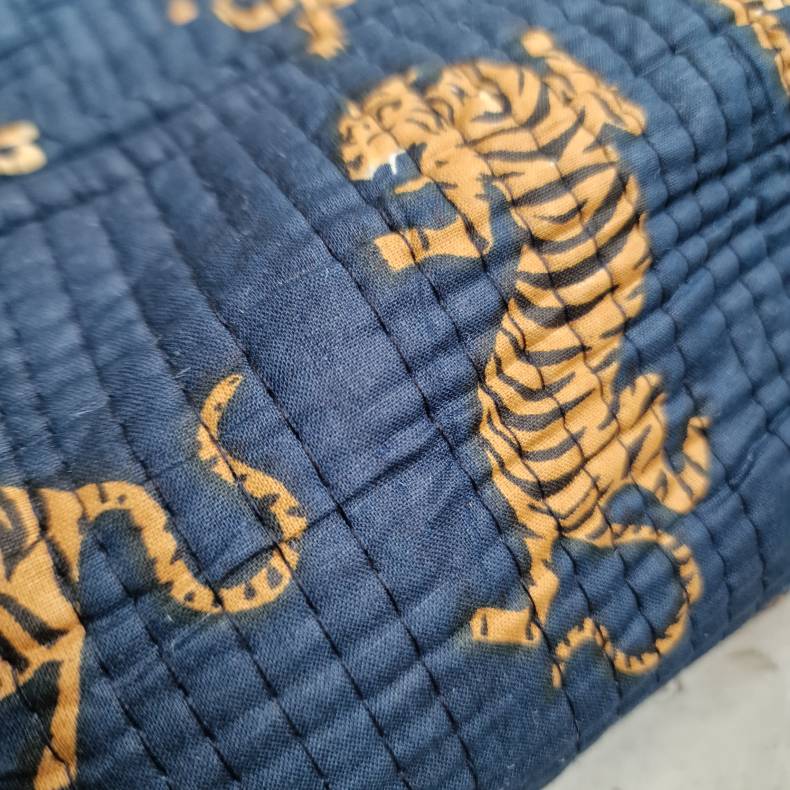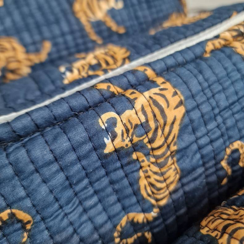 Disse mørkeblå kosmetik- og toilettasker er håndlavede i Indien og dekoreret med traditionelle bloktryk, hvor majestætiske tigere fremstår i smukke detaljer på en dyb blå baggrund. Hvert mønster er skabt med håndskårne træblokke, der dyppes i farve og trykkes præcist på bomuldsstoffet, hvilket giver et unikt og levende design. Kombinationen af den mørkeblå baggrund og de detaljerede tigermotiver skaber et elegant, eksotisk og kunstnerisk udtryk.