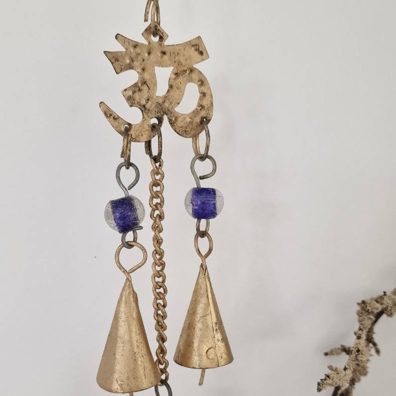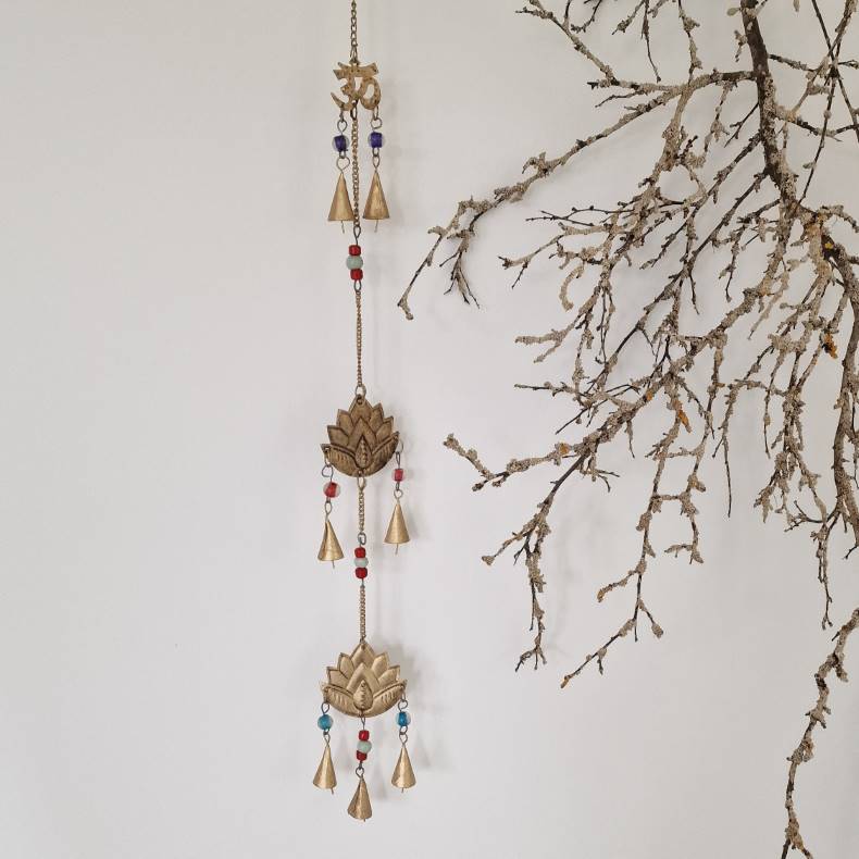 Dette unikke ophæng stråler med Ohm-universets symbol øverst og to elegante lotusblomster, skabt af genbrugsmetal fra et marked i Jaipur, Indien. Hver detalje, fra de store, rustikke glasperler til de fine klokker, bidrager til dets unikke charme og karakter.