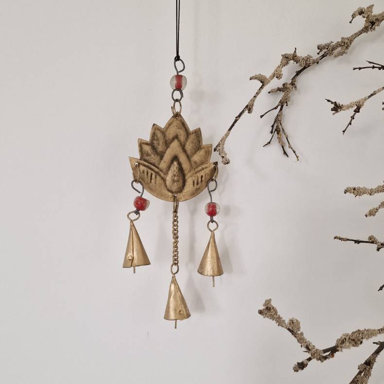 Giv dit hjem en smule zen med dette charmerende vedhæng. Fremstillet af rød genbrugsmetal, det prydes af en stor lotusblomst omgivet af tre stilfulde klokker. Hver klokke er dekorativt designet og suppleret med rustikke genbrugsglasperler i rød, hvilket tilføjer en primitiv elegance til enhver indretning.