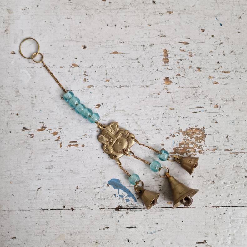 Dybt forankret i håndværkets kunst pryder vores Ganesha ophæng ethvert rum med sin unikke skønhed. Fremstillet af solid messing, dette lille mesterværk emmer af både styrke og elegance. Fine turkise håndlavede glasperler tilføjer et strejf af farve og en følelse af dybde til det ellers skinnende messing.
