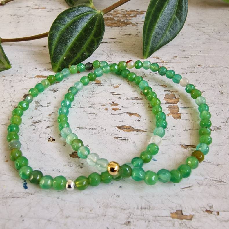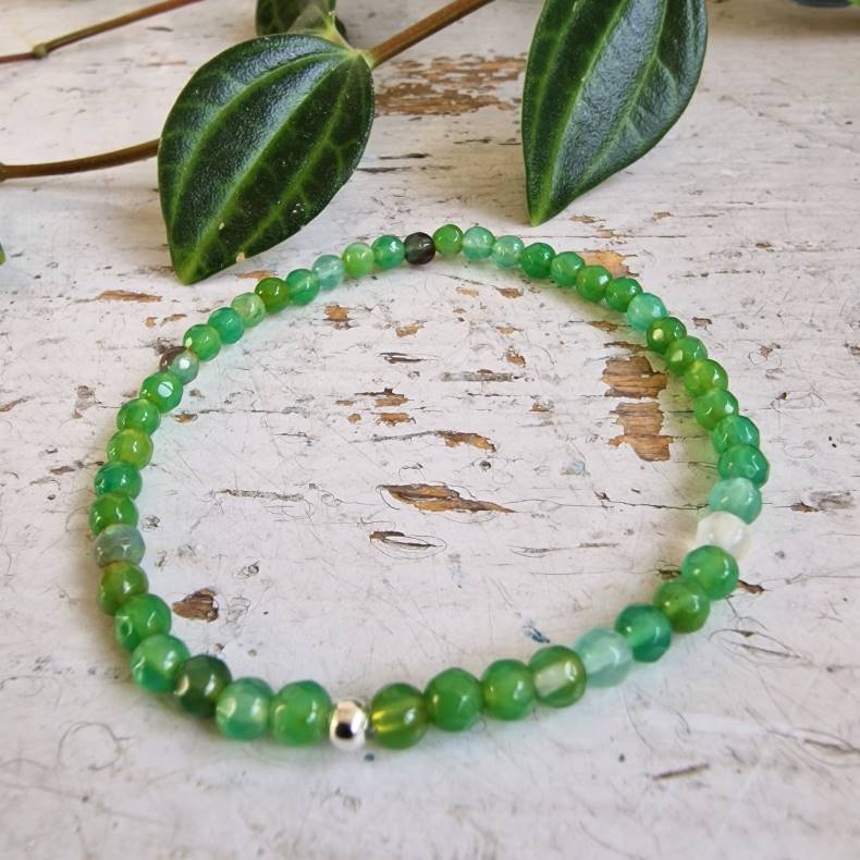 Dette stenarmbånd er den perfekte balance mellem enkelthed og raffinement. De smukt facetslebne 4 mm sten i indfarvet agater bringer en subtil dybde og karakter, hvor de grønne nuancer skaber en harmonisk og frisk stemning.