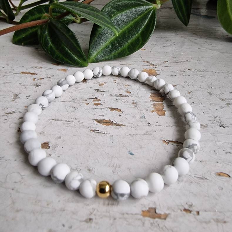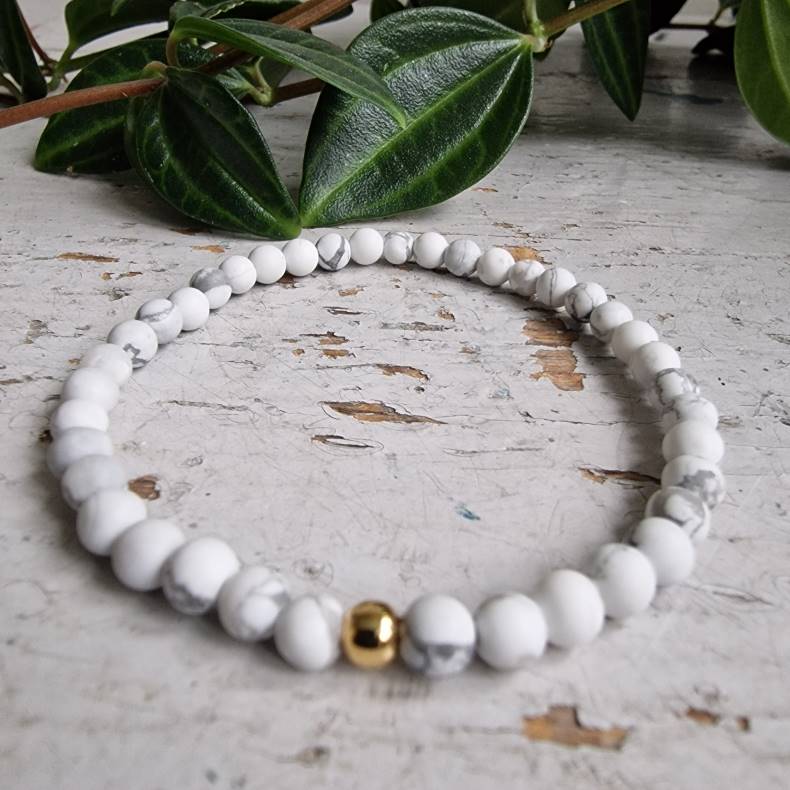 Dette armbånd er både let og elegant med sine smukke, matslebne hvide howlite-sten på 4 mm, der giver et sofistikeret og tidløst look. Den forgyldte stål kugle tilføjer et subtilt, luksuriøst touch og gør det til den perfekte kombination med andre armbånd.