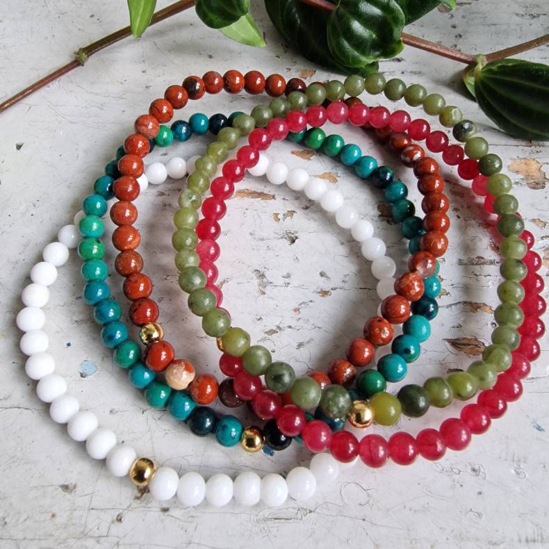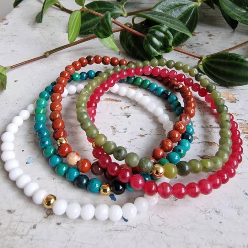 Armbåndene kan bæres samlet for et fyldigt og farverigt look eller hver for sig for en mere subtil effekt. Hver sten har sin egen symbolik, fra rød jaspis’ jordforbindelse til chrysochollas rolige energi – og så ser de bare godt ud!