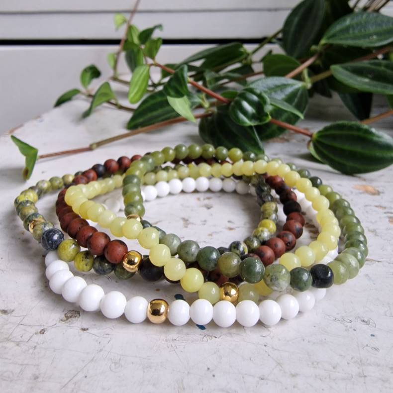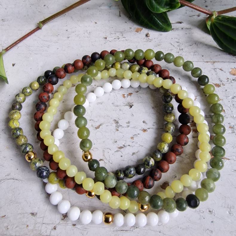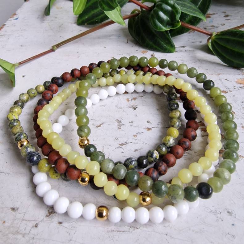 Disse fem spinkle armbånd er skabt til at tilføje noget helt særligt til din smykkesamling. Med smukke 4 mm sten i brun jaspis, jade og en skala af grønne nuancer af jaspis kombineret med en forgyldt messingkugle, er der tænkt på alt fra farvespil til elegance.