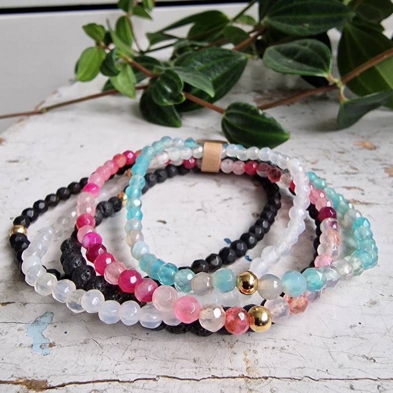 Lad os introducere fem elegante armbånd, der leger med farver og teksturer. Med deres spinkle 4 mm sten oser de af stilfuld enkelhed, og hver perle fortæller sin egen historie. Her møder facetslebet agat i pink, hvid, turkis og sort den rå, porøse struktur af lava – krydret med en forgyldt messingkugle, der giver et strejf af luksus.