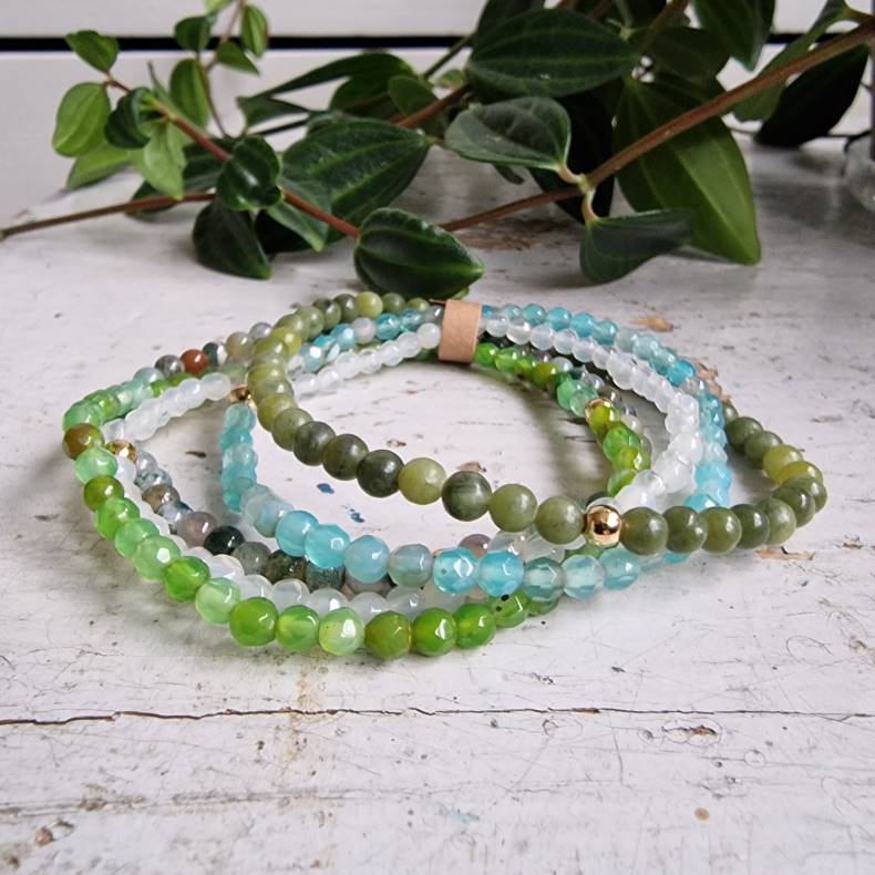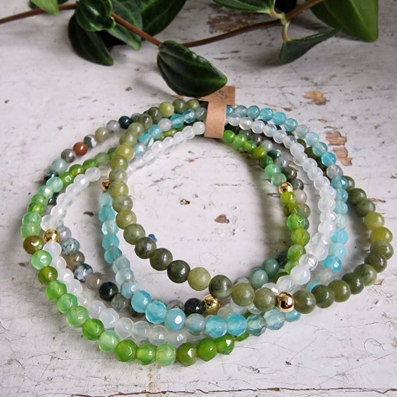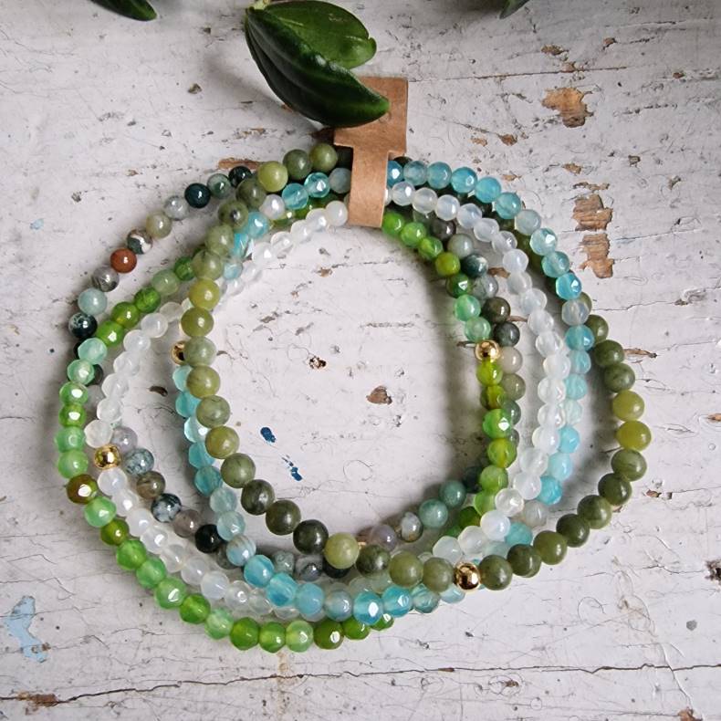 Sæt kulør på dagen med dette sæt af fem elegante stenarmbånd – 4 stk. lavet med 4 mm små, facetslebne  agateperler, der balancerer det spinkle og det sofistikerede. Farverne spænder fra friske grønne og turkis nuancer til klassisk hvid, alt sammen skabt af naturlige skatte som agater, mossagat og grøn jaspis. Som en lille eksklusiv detalje bryder en forgyldt messingkugle harmonien med et strejf af gyldent varme.