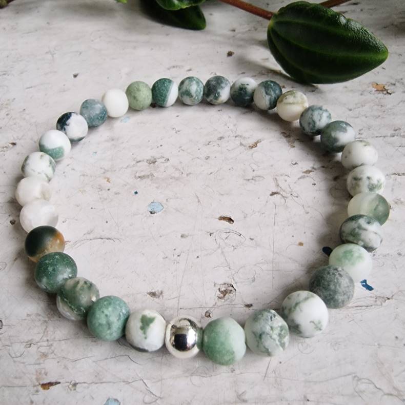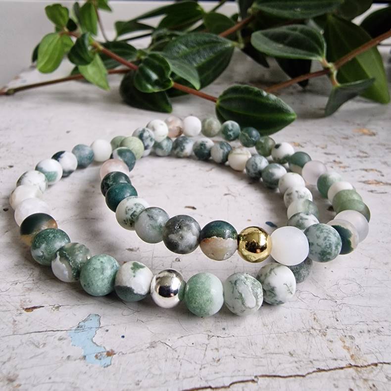 Dette armbånd er skabt af 6 mm matslebne træ-agate sten, der med deres frostede grønne nuancer bringer naturens rå charme direkte til dit håndled. Den perfekte størrelse gør det diskret nok til hverdagsbrug, men alligevel markant nok til at tilføje karakter til dit look. Og det bedste? Det er unisex, så det handler kun om stil, ikke køn.