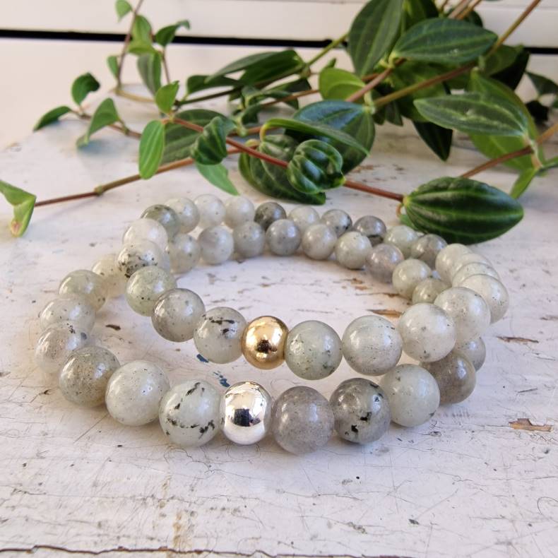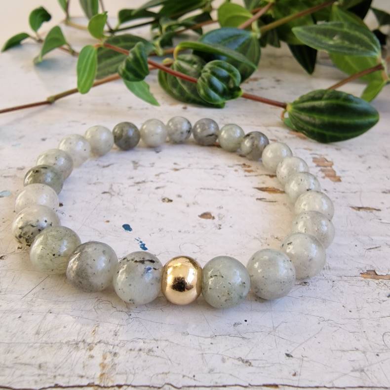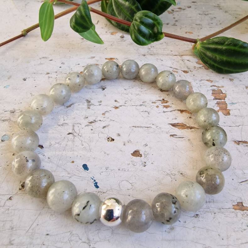 Dette armbånd er ikke bare smykke – det er en statement. De smukke 8 mm lysegrå labradorit-sten fanger lyset på en diskret og elegant måde, og gør sig lige godt på både mænd og kvinder. Detaljen med en messingperle, som du kan vælge i enten forsølvet eller forgyldt finish, giver smykket et raffineret twist, der passer til enhver stil.