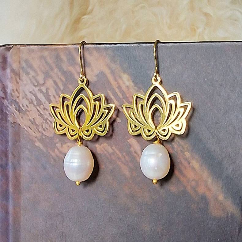 Disse ørering kombinerer elegance og symbolik på smukkeste vis. En stor, laserskåret Lotus i forgyldt stål hænger yndefuldt sammen med en naturlig ferskvandsperle, hvilket giver et eksklusivt udtryk.