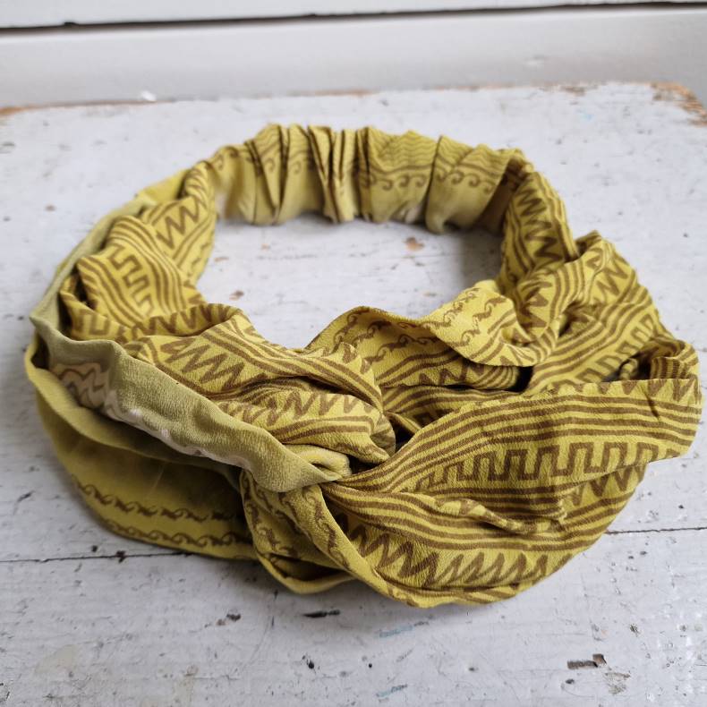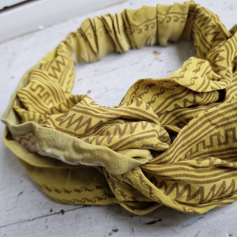 Løft dit look med et lime hårbånd, der har både historie og sjæl. Håndlavet af vintage silke saree, er hver enkelt helt unik – ingen to er ens!