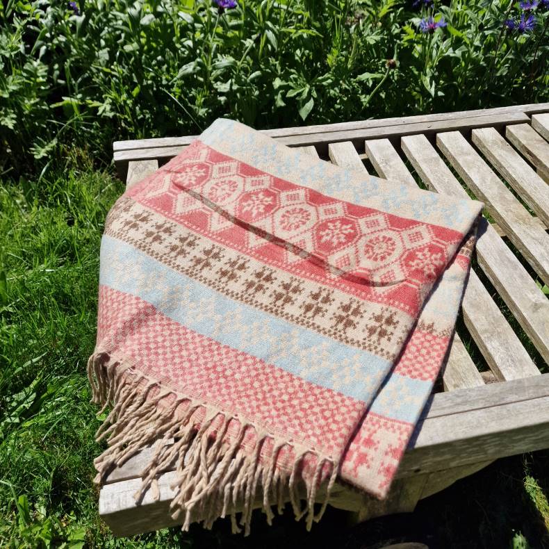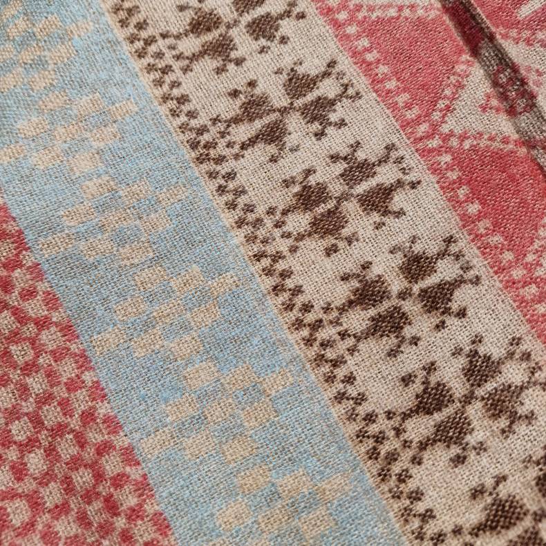 Med et væld af bløde pastelfarver bringer dette grafiske uldtæppe et strejf af moderne elegance til dit hjem. Kombinationen af lyseblå, rosa og brun skaber et unikt visuelt spil, der fanger øjet uden at overvælde. Perfekt til at lune dig med i stuen eller måske som et farverigt touch i soveværelset.