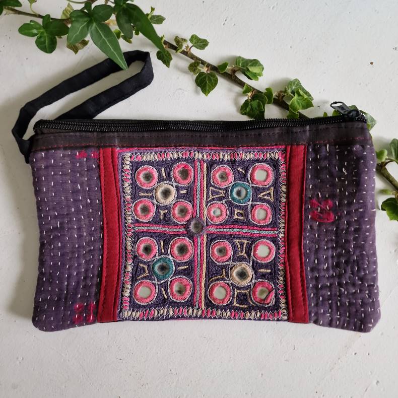 Violet kantha clutch med smukt spejlstykke