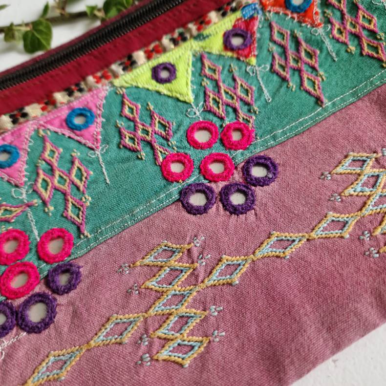 Clutchen præsenterer sig i støvede farver, der minder om solens kys og tidens blide hånd. Den er lavet af smukt gammelt stof med delikate broderier og små spejle, der fanger lyset og dit blik.