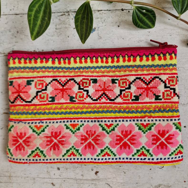 Håndbroderet Clutch med Blomster og Farverige Zigzag-bånd – Rosa & Lys Baggrund