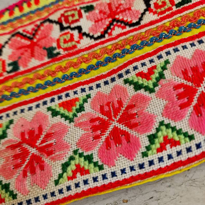 Dekorative zigzag-bånd i forskellige farver langs kanten tilfører ekstra personlighed og gør hver taske unik. Taskens design kombinerer traditionelt håndværk med et moderne, ungdommeligt twist, perfekt til både hverdag og fest.