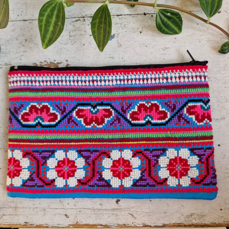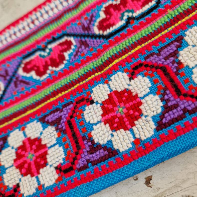 Denne håndbroderede clutch er et farverigt kunstværk med blomsterbroderi, der stråler på en smuk blå baggrund. Fine lilla og hvide detaljer fremhæver mønsterets dybde, mens varme pink og røde nuancer giver liv og kontrast. Broderiet er tæt og detaljeret, hvilket skaber en harmonisk kombination af farver og et elegant, håndlavet udtryk.