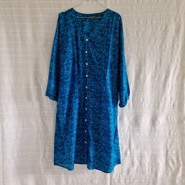Lækker Kjole syet i omhyggeligt udvalgt vintage silke saree, unik og kun den ene.  V-hals , knapper ned foran samt bindebånd
