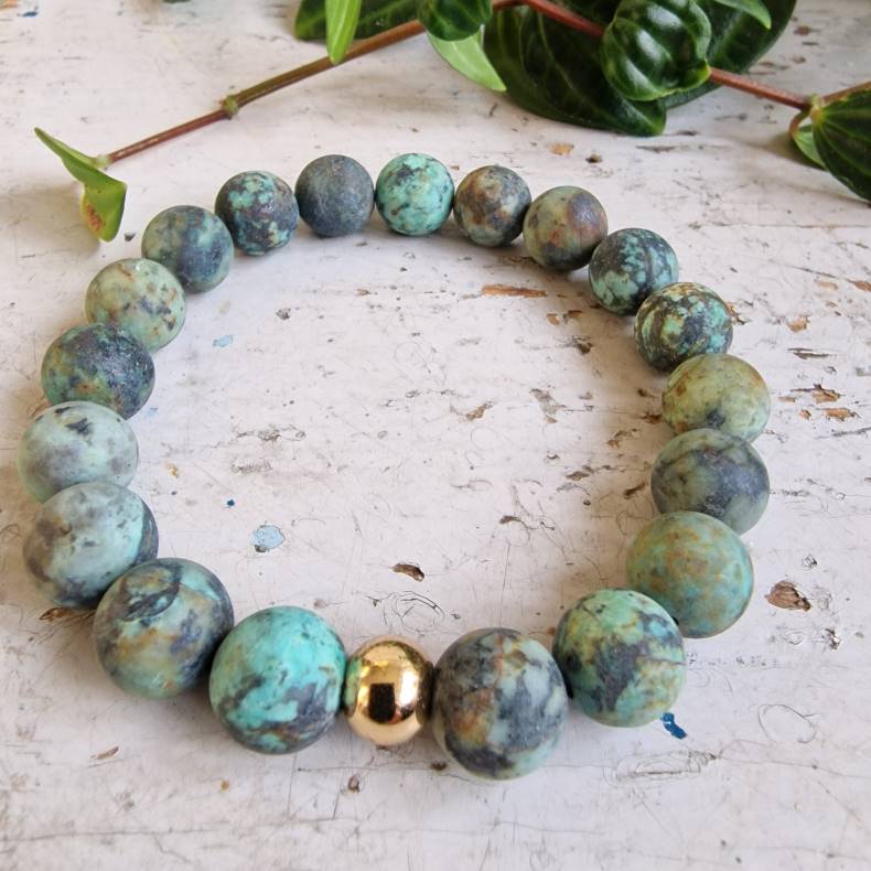 Tilføj et skarpt og maskulint touch til dit outfit med dette armbånd i 10 mm afrikanske turkissten – en raffineret variant af jaspis, der balancerer råhed og elegance. De naturlige grønne og turkise nuancer bringer dybde til looket og komplimenterer ofte skandinaviske træk på imponerende vis.