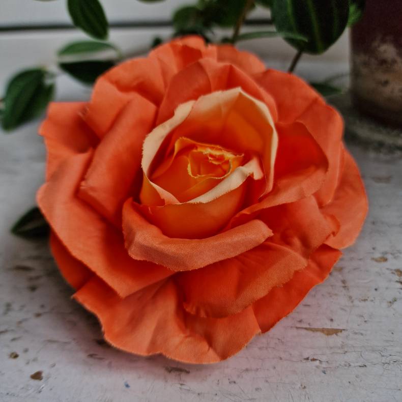Denne orange rosenblomst måler ca. 11 cm og emmer af klassisk elegance.