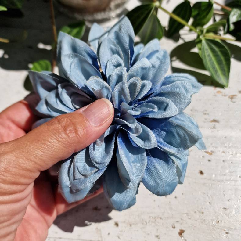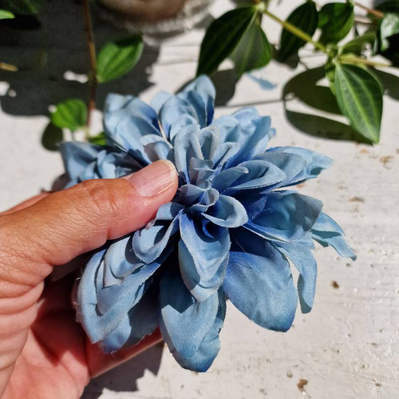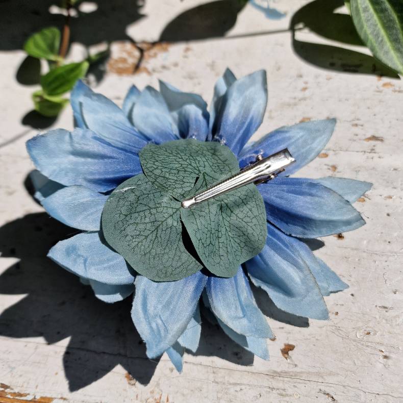 En smuk, lidt støvet blå georgine i naturtro stof, ca. 12-14 cm i diameter, der tilfører et friskt og stilfuldt touch til dit look. Blomsten er monteret med en praktisk clips, som gør den nem at sætte på kjolen, jakken, tasken eller tørklædet.