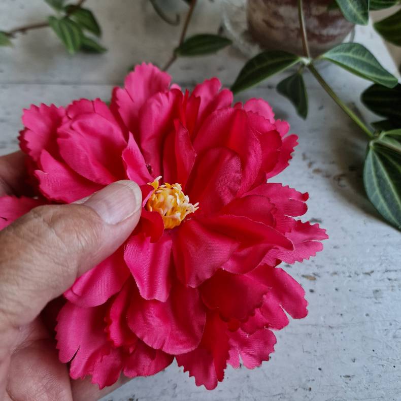 En strålende pink pæon i naturtro stof, ca. 12 cm i diameter, der emmer af passion, varme og klassisk femininitet.