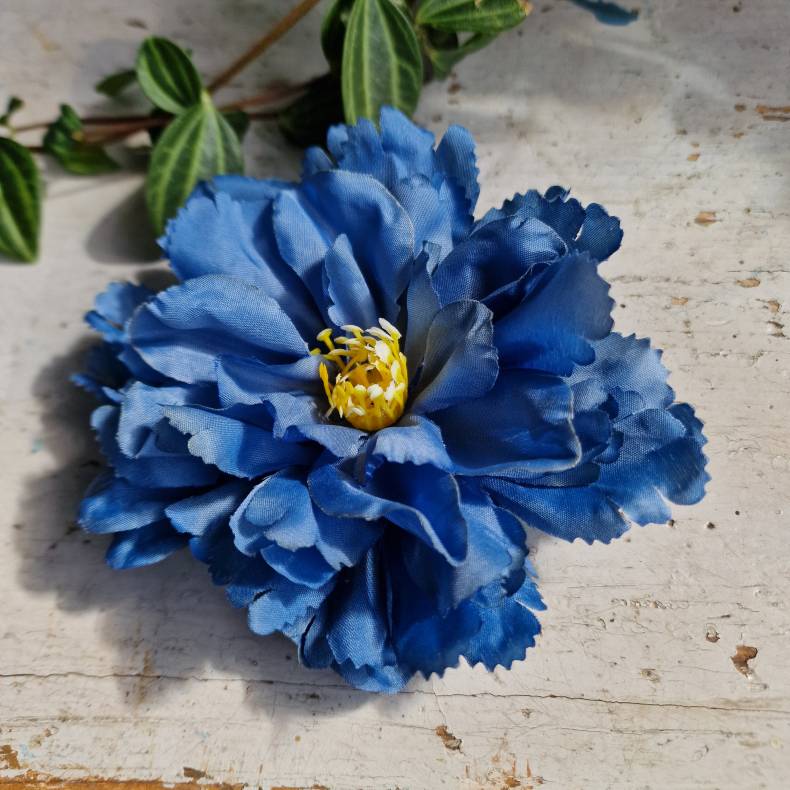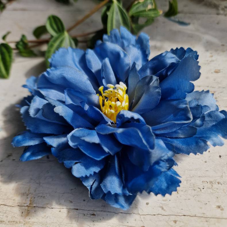 En smuk blå pæon i naturtro stof, ca. 12 cm i diameter, der udstråler ro, elegance og en forfriskende lethed.