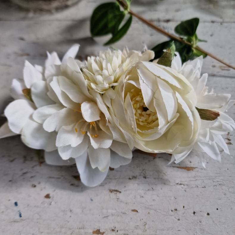 Et romantisk hårspænde dekoreret med et væld af hvide og flødefarvede blomster, der tilsammen skaber et tidløst og elegant udtryk.